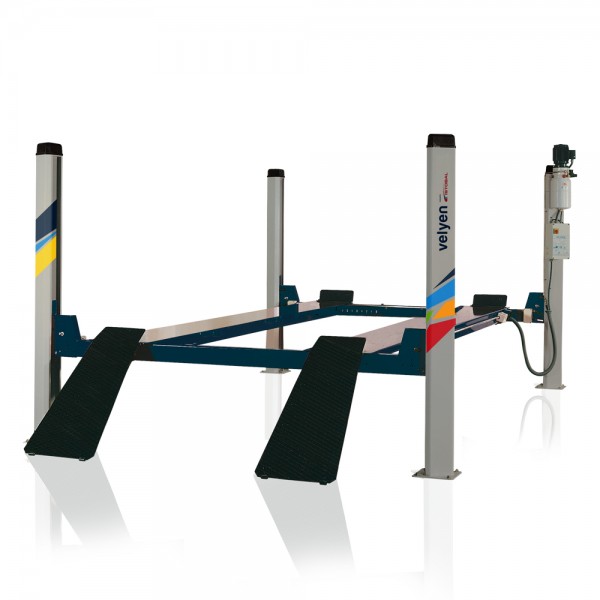De Velyen 4ED0300 is een hydraulische 4-koloms hefbrug met vlakke rijbanen en heeft een hefcapaciteit van 3.500 kg. Het heeft onderhoudsvrije lagers en staalkabels. De kolommen en rijbanen zijn gepoedercoat.